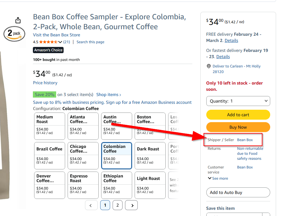 Go to the product detail page of any of the seller’s products and click on the seller’s name from the Buy Box.