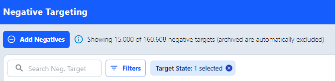In the “Negative Targeting” tab in AdLabs, filter for negative targets that are enabled and review them. Please not that we are only able to show up to 15,000 negatives at a time so you may need to look through additional pages