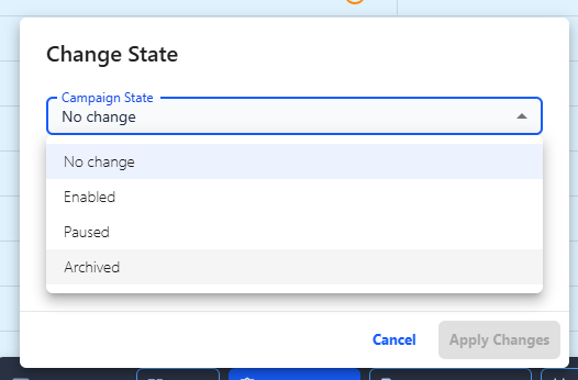 Then, select the campaigns to archive, click "Bulk Actions” from the action bar, “Change Bid State” and select “Archived”.