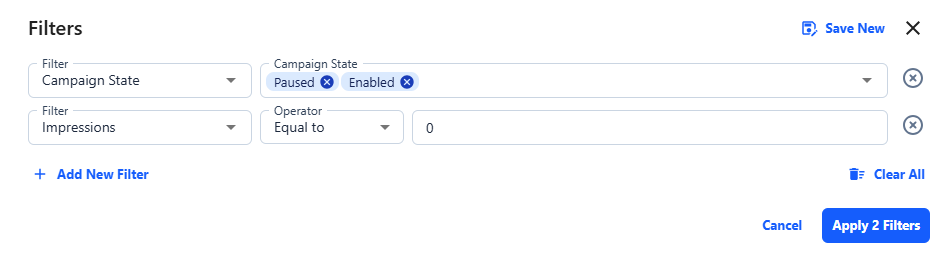 From the Campaign Optimizer tab, filter for any paused or enabled campaigns with zero impressions in the last 365 days.