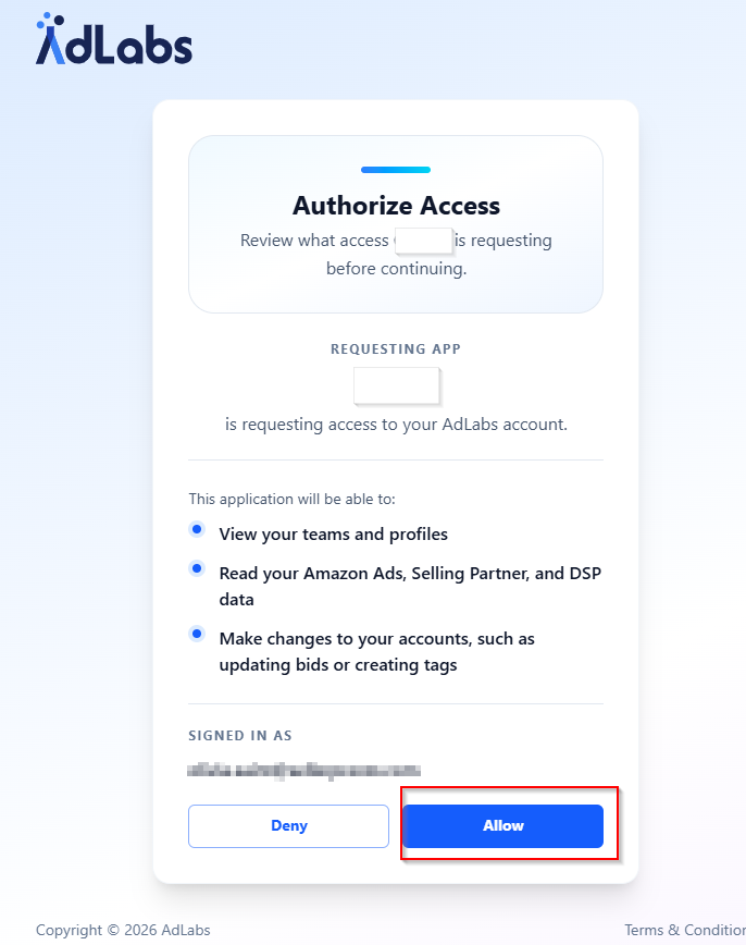 The AdLabs app will open. Click “Allow” to authorize the access.