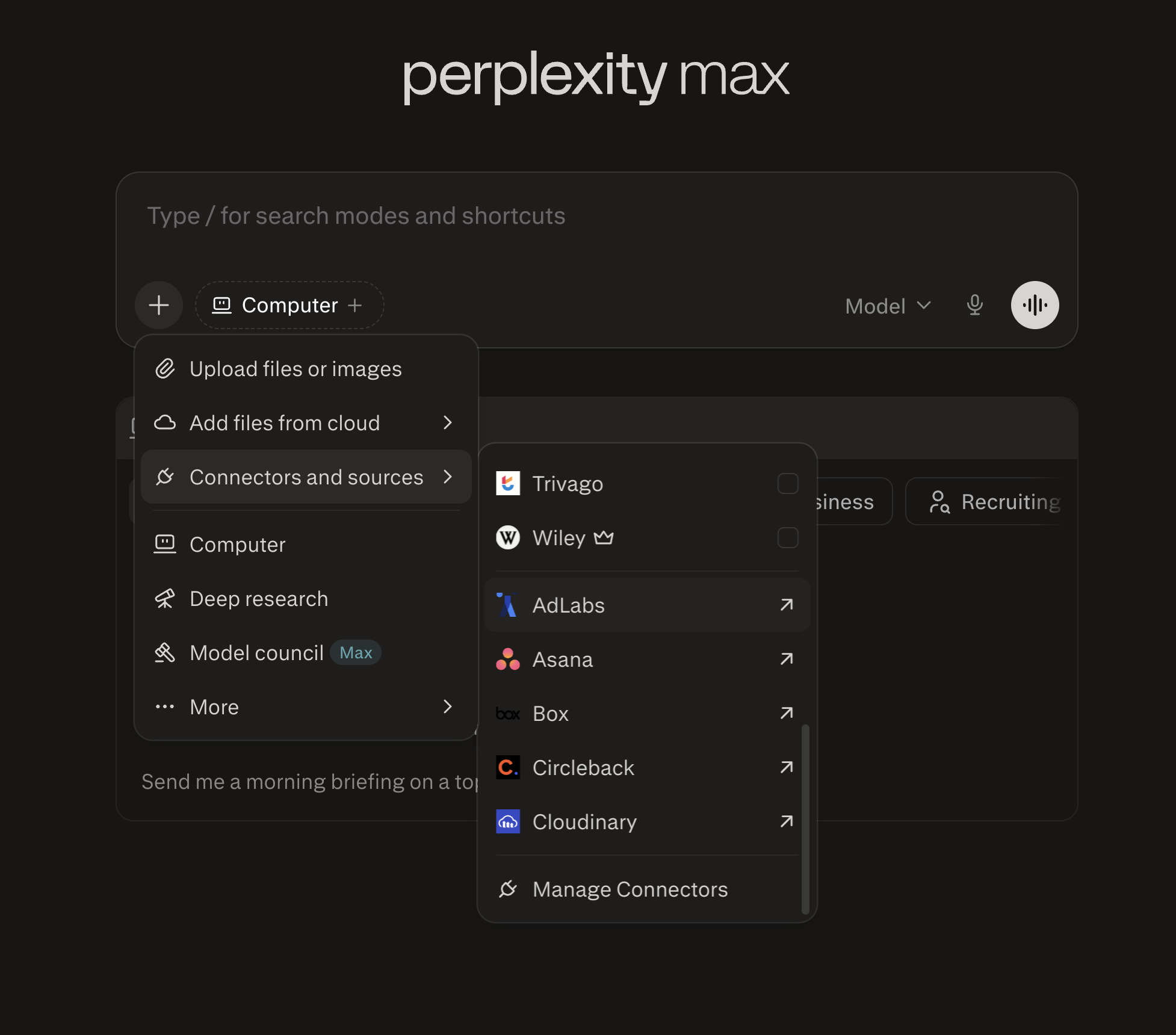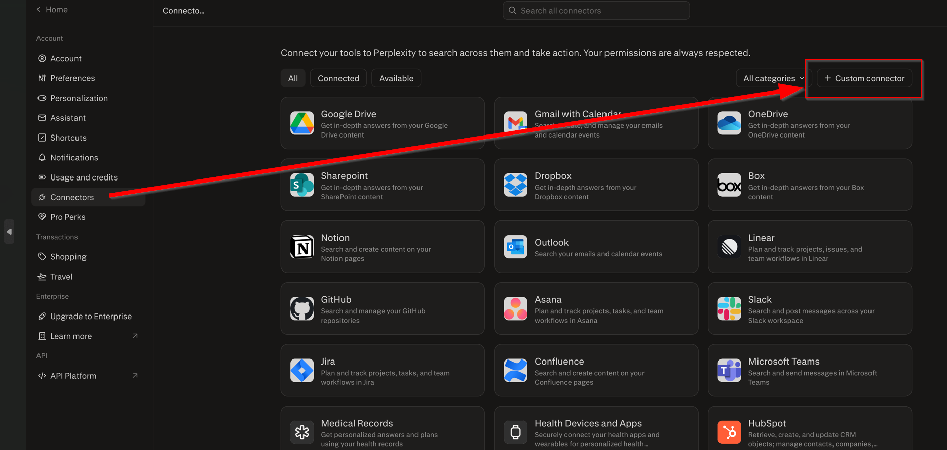 In either the Perplexity desktop app or from your browser, from your “Account” go to “Connectors” from the side panel.