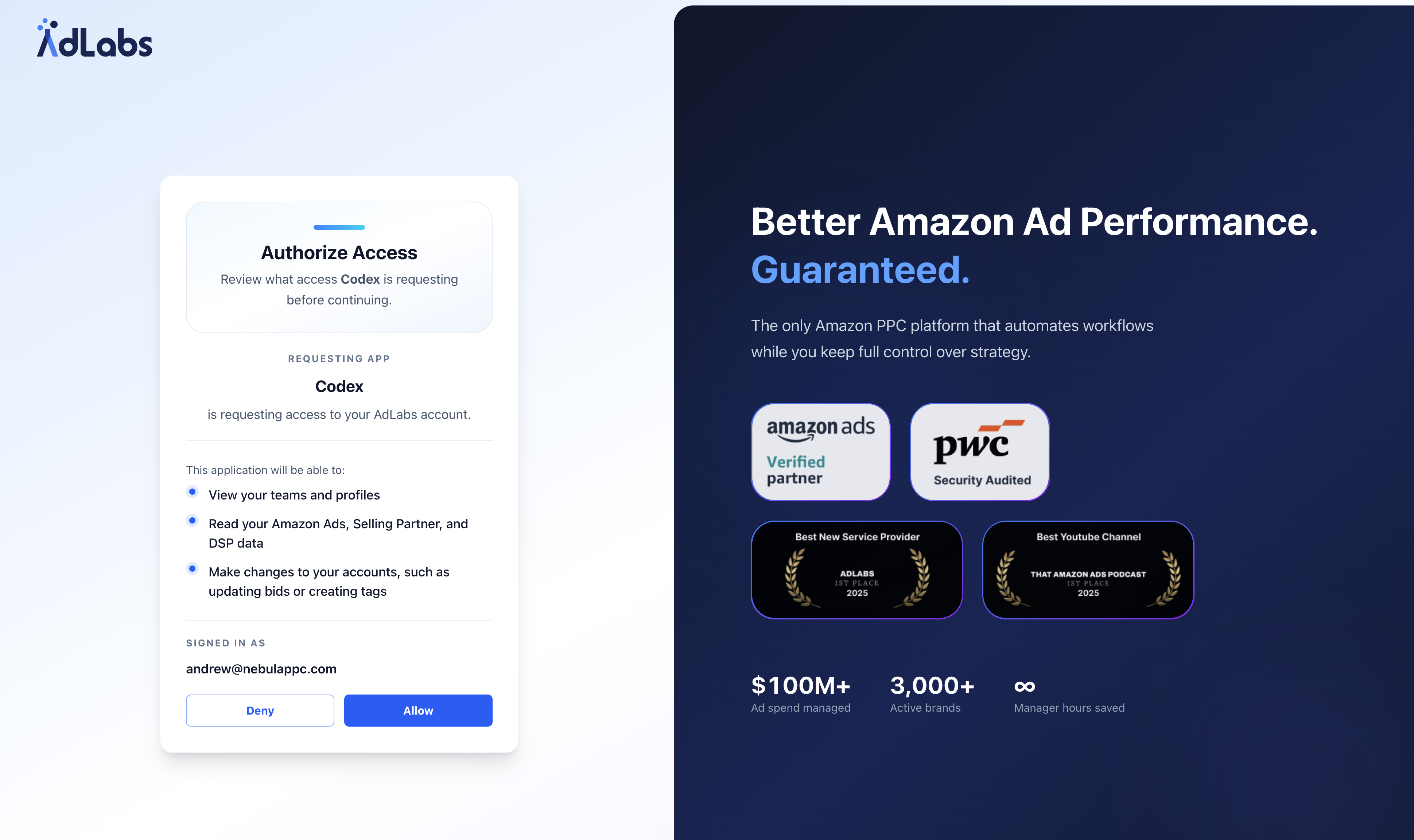 The AdLabs app will open. Click “Allow” to authorize the access.