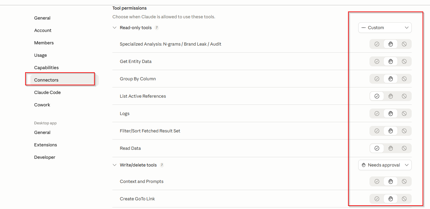 Permissions are not configured inside AdLabs. Instead, you control what the MCP is allowed to do within your AI tool's connector settings.